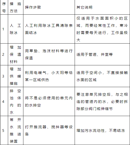 2、凡是存留有水分的污水和污泥管線(xiàn)、設(shè)備均需考慮防凍,防凍的措施包括加保溫、伴熱、保持介質(zhì)連續(xù)流動(dòng),使停用的管線(xiàn)、設(shè)備中不得存留含水介質(zhì)。